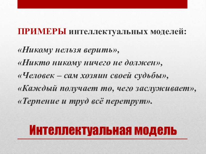 Интеллектуальная модельПРИМЕРЫ интеллектуальных моделей:«Никому нельзя верить»,«Никто никому ничего не должен»,«Человек – сам хозяин своей судьбы»,«Каждый получает то,