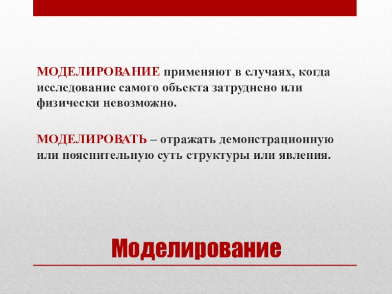 Моделирование МОДЕЛИРОВАНИЕ применяют в случаях, когда исследование самого объекта затруднено или физически невозможно.МОДЕЛИРОВАТЬ – отражать демонстрационную или