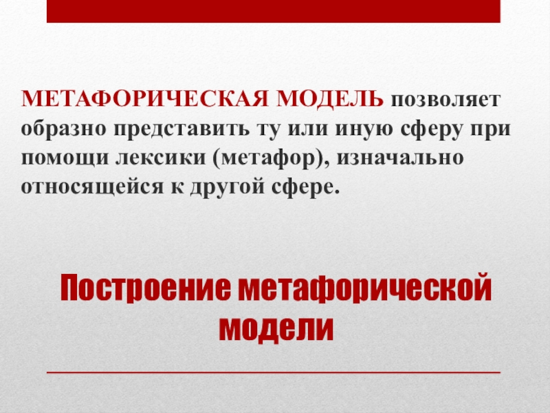 Построение метафорической моделиМЕТАФОРИЧЕСКАЯ МОДЕЛЬ позволяет образно представить ту или иную сферу при помощи лексики (метафор), изначально относящейся