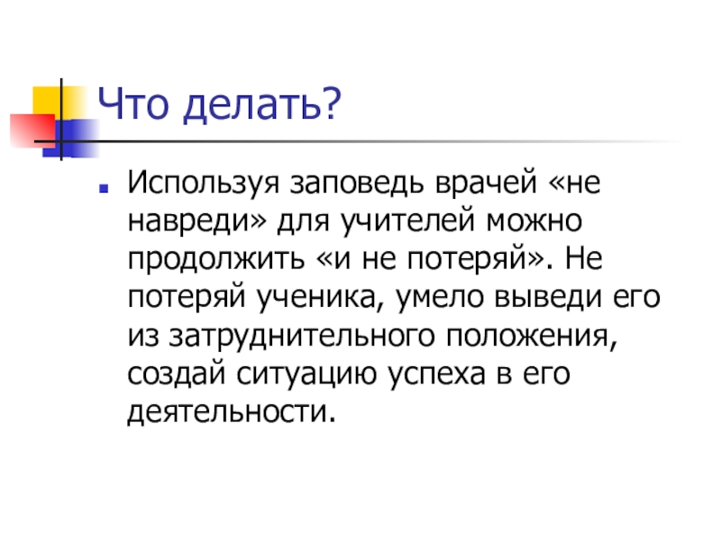 Что делать?Используя заповедь врачей «не навреди» для учителей можно продолжить «и не потеряй». Не потеряй ученика, умело