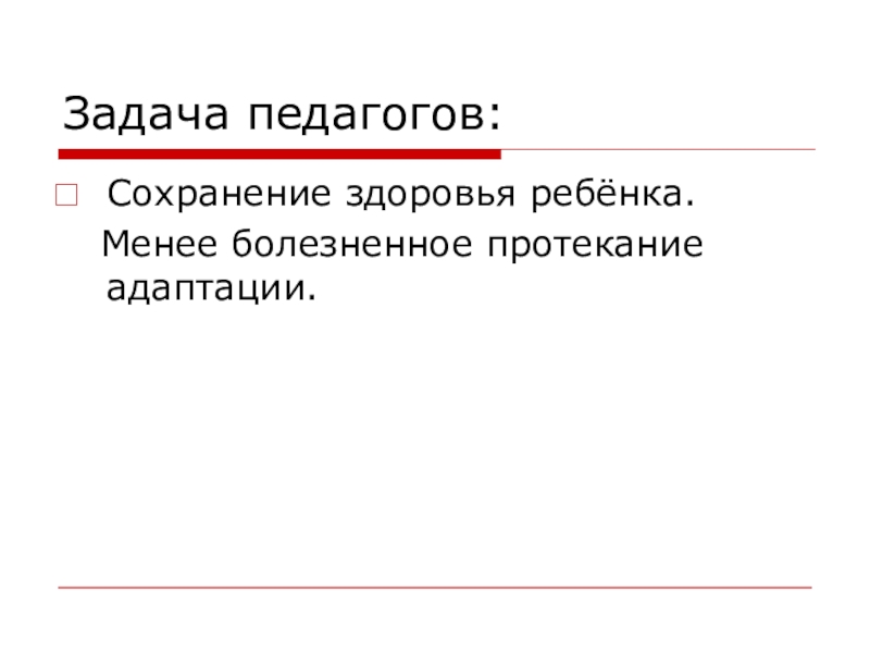 Задача педагогов:Сохранение здоровья ребёнка.  Менее болезненное протекание адаптации.