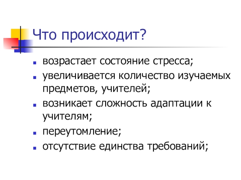 Что происходит?возрастает состояние стресса;увеличивается количество изучаемых предметов, учителей;возникает сложность адаптации к учителям;переутомление;отсутствие единства требований;