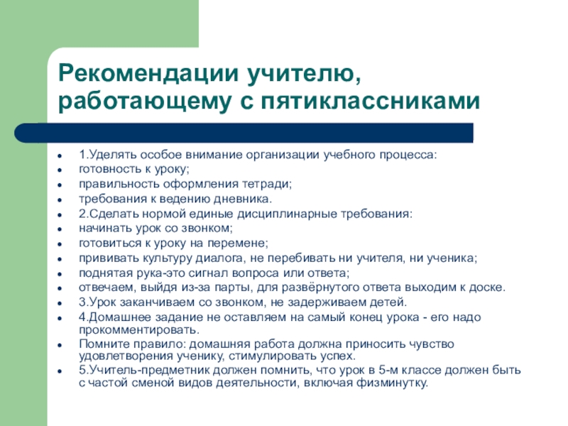 Рекомендации учителю, работающему с пятиклассниками1.Уделять особое внимание организации учебного процесса:готовность к уроку;правильность оформления тетради;требования к ведению дневника.2.Сделать