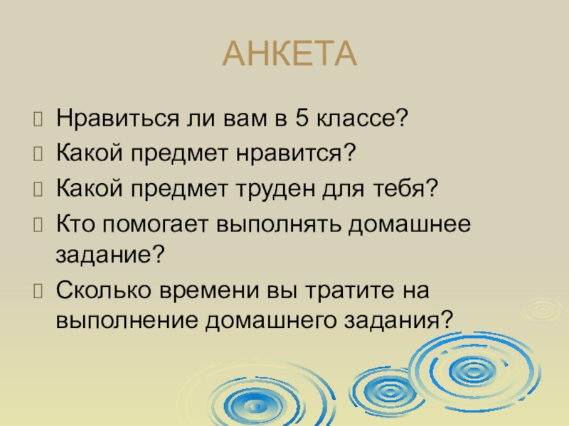 АНКЕТАНравиться ли вам в 5 классе?Какой предмет нравится?Какой предмет труден для тебя?Кто помогает выполнять домашнее задание?Сколько времени