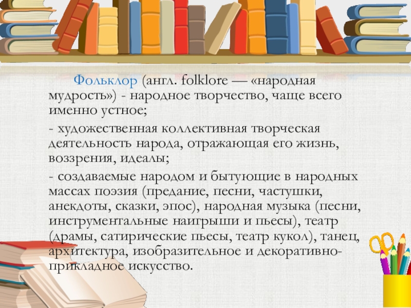 Слайд 3 Фольклор (англ. folklore — «народная мудрость») - народное творчество, чаще