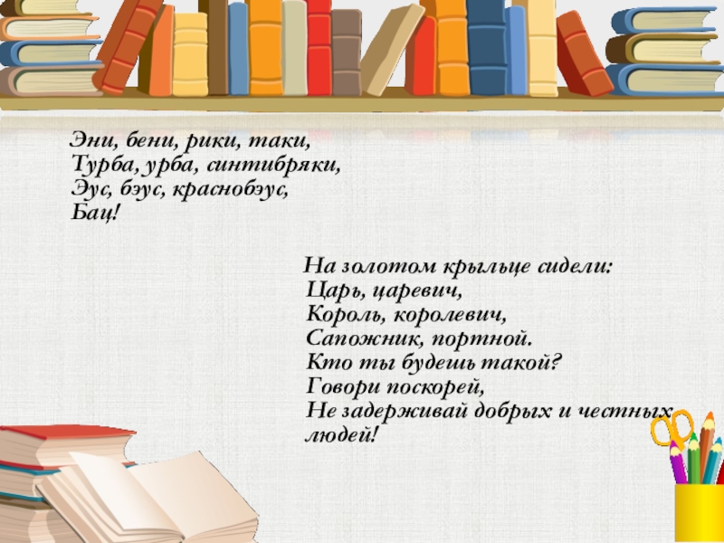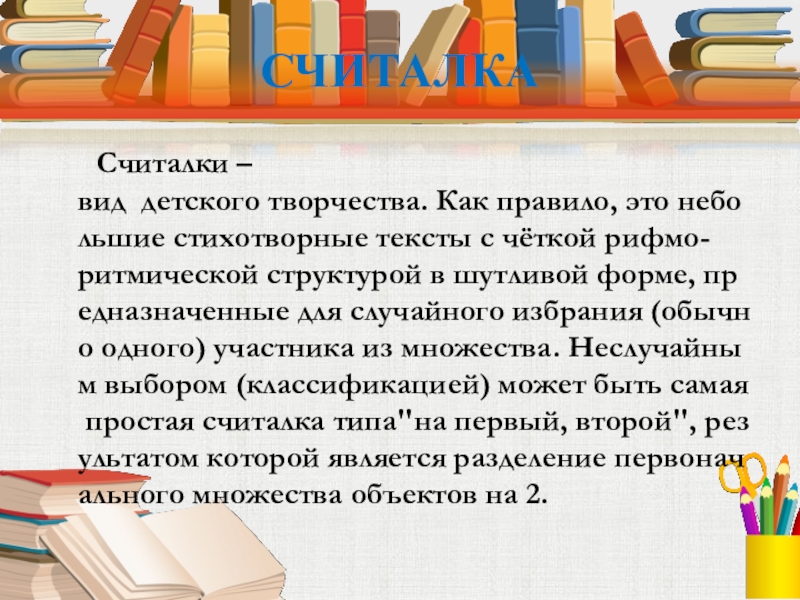 Считалки – вид детского творчества. Как правило, это небольшие стихотворные тексты с чёткой рифмо-ритмической структурой в шутливой форме, предназначенные для случайного избрания (обычно одного) участника из множества. Неслучайным выбором (классификацией) может быть самая простая считалка типа"на первый, второй", результатом которой является разделение первоначального множества объектов на 2.