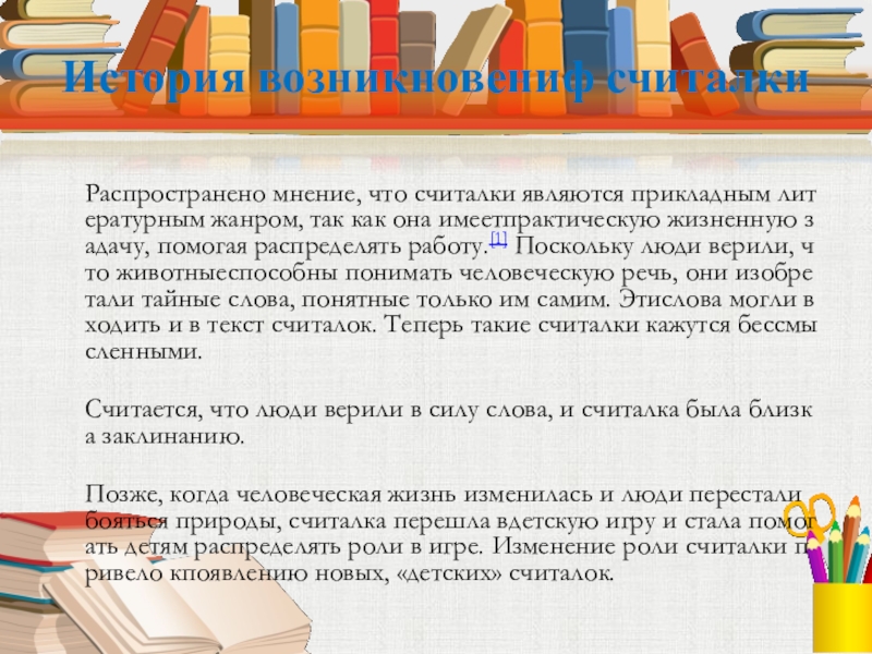 Распространено мнение, что считалки являются прикладным литературным жанром, так как она имеетпрактическую жизненную задачу, помогая распределять работу.[1] Поскольку люди верили, что животныеспособны понимать человеческую речь, они изобретали тайные слова, понятные только им самим. Этислова могли входить и в текст считалок. Теперь такие считалки кажутся бессмысленными.