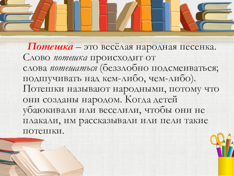 Слайд 9 Потешка – это весёлая народная песенка. Слово потешка происходит от слова потешаться (беззлобно
