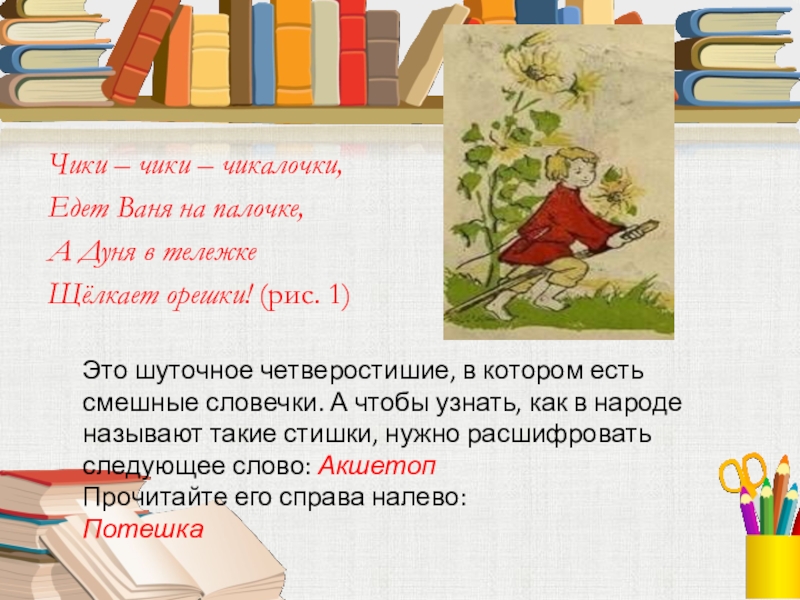 Это шуточное четверостишие, в котором есть смешные словечки. А чтобы узнать, как в народе называют такие стишки, нужно расшифровать следующее слово: Акшетоп