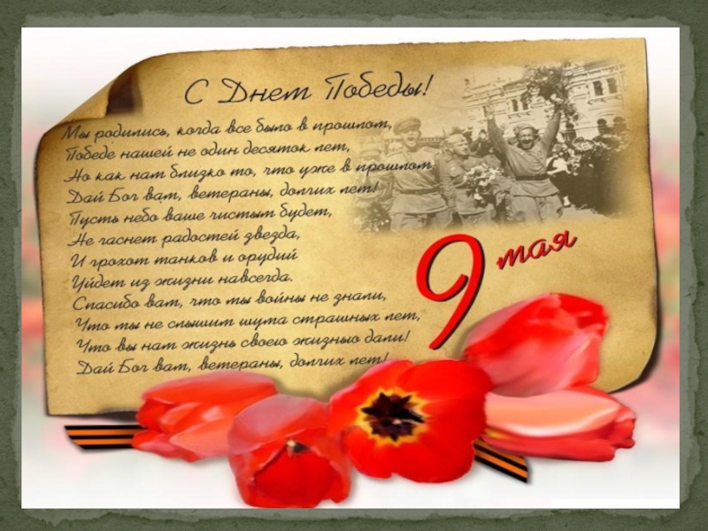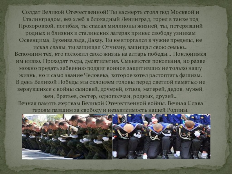 хлеб в блокадный Ленинград, горел в танке под Прохоровкой, погибая, ты спасал миллионы жизней, ты, потерявший родных и близких в сталинских лагерях принес свободу узникам Освенцима, Бухенвальда, Дахау. Ты не вторгался в чужие пределы, не искал славы, ты защищал Отчизну, защищал свою семью…