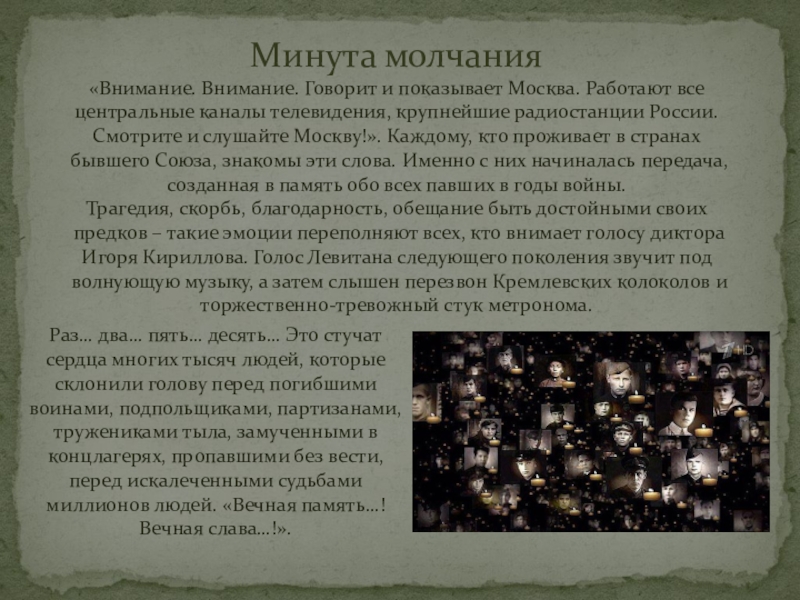 телевидения, крупнейшие радиостанции России. Смотрите и слушайте Москву!». Каждому, кто проживает в странах бывшего Союза, знакомы эти слова. Именно с них начиналась передача, созданная в память обо всех павших в годы войны.