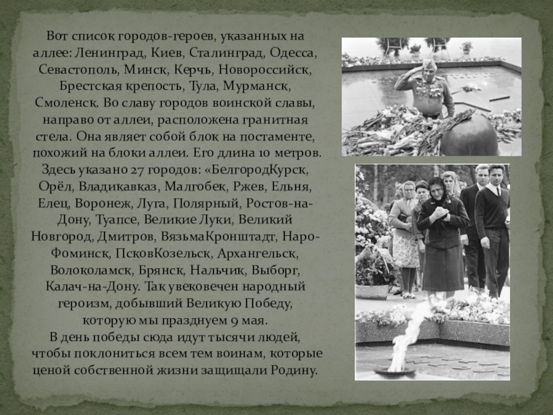 Слайд 8Вот список городов-героев, указанных на аллее: Ленинград, Киев, Сталинград, Одесса, Севастополь,