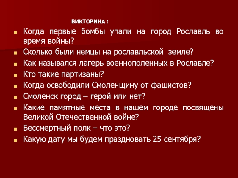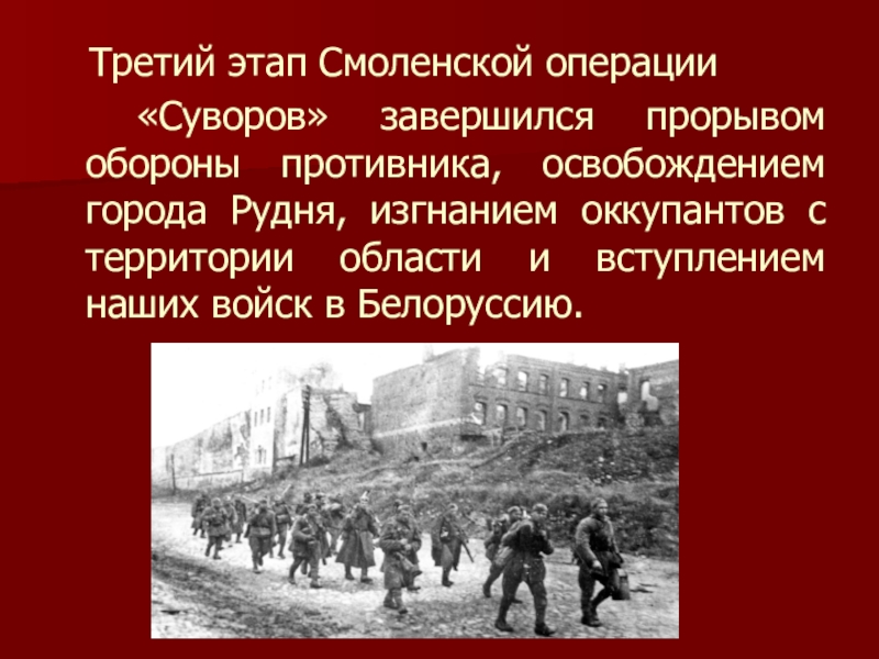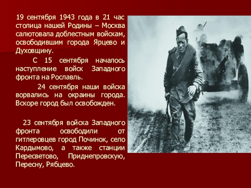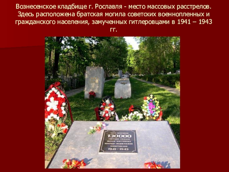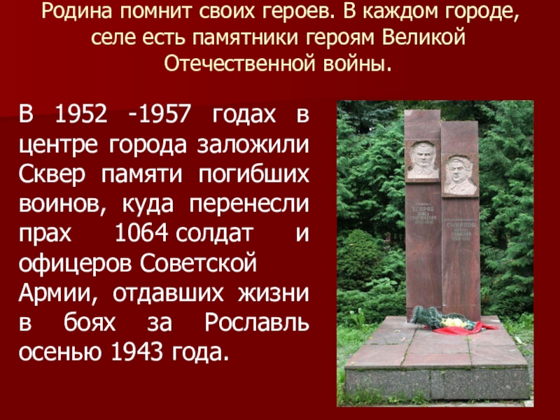 В 1952 -1957 годах в центре города заложили Сквер памяти погибших воинов, куда перенесли прах 1064 солдат и офицеров Советской Армии, отдавших жизни в боях за Рославль осенью 1943 года.