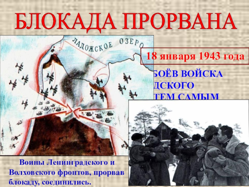 « … ПОСЛЕ СЕМИДНЕВНЫХ БОЁВ ВОЙСКА ВОЛХОВСКОГО И ЛЕНИНГРАДСКОГО ФРОНТОВ СОЕДИНИЛИСЬ И ТЕМ САМЫМ ПРОРВАЛИ БЛОКАДУ ЛЕНИНГРАДА…»