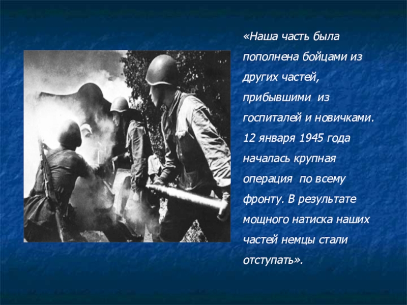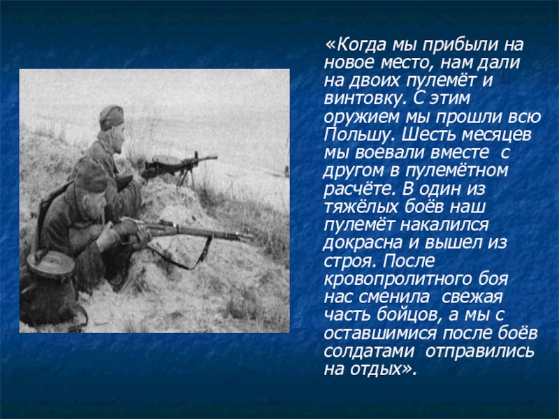 двоих пулемёт и винтовку. С этим оружием мы прошли всю Польшу. Шесть месяцев мы воевали вместе с другом в пулемётном расчёте. В один из тяжёлых боёв наш пулемёт накалился докрасна и вышел из строя. После кровопролитного боя нас сменила свежая часть бойцов, а мы с оставшимися после боёв солдатами отправились на отдых».