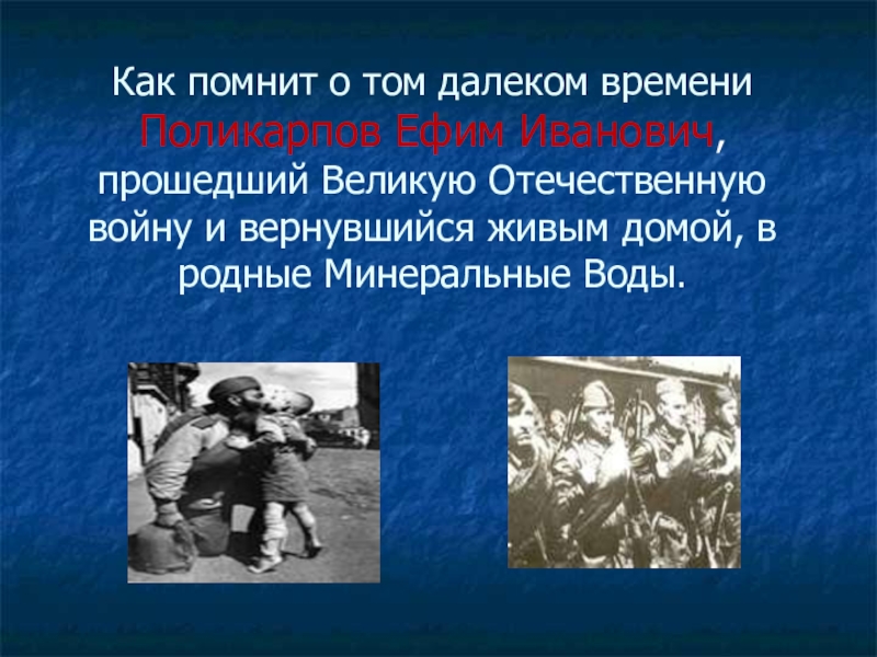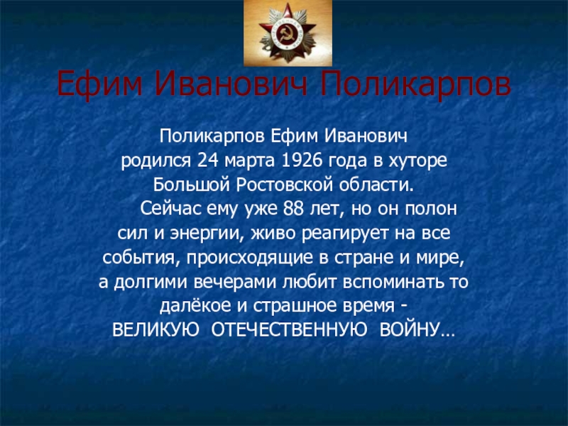 Слайд 6Как помнит о том далеком времени Поликарпов Ефим Иванович, прошедший Великую