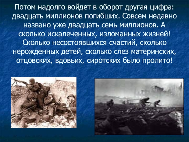 Слайд 4Потом надолго войдет в оборот другая цифра: двадцать миллионов погибших. Совсем