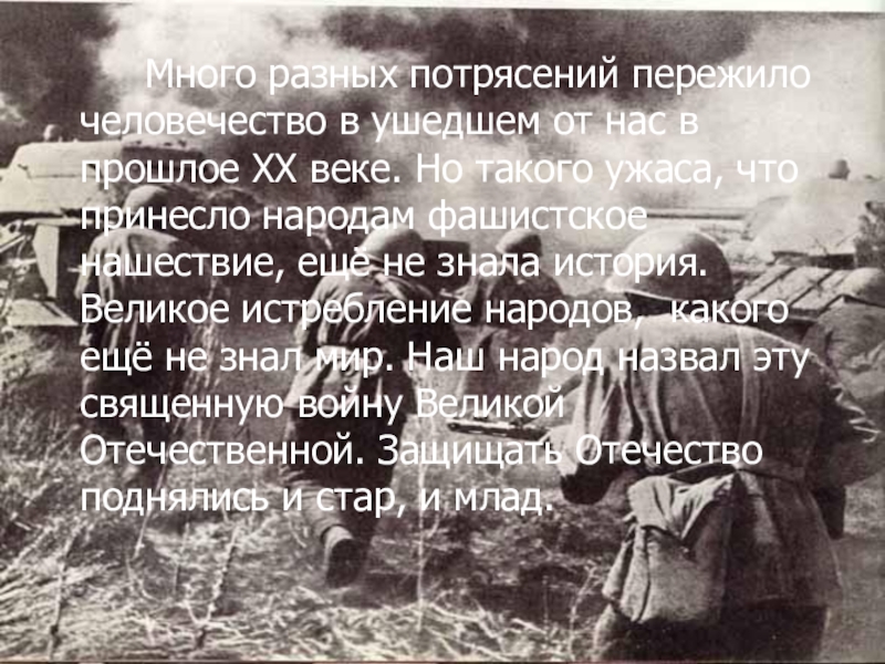от нас в прошлое XX веке. Но такого ужаса, что принесло народам фашистское нашествие, ещё не знала история. Великое истребление народов, какого ещё не знал мир. Наш народ назвал эту священную войну Великой Отечественной. Защищать Отечество поднялись и стар, и млад.