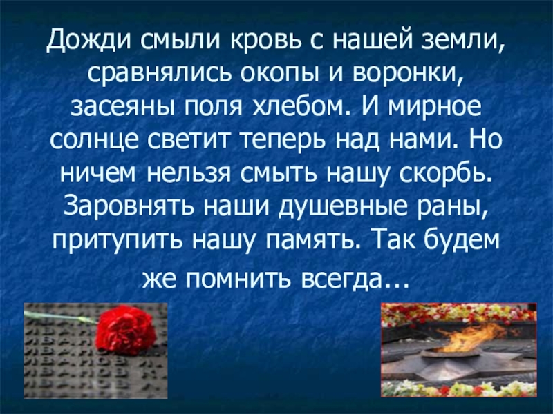 поля хлебом. И мирное солнце светит теперь над нами. Но ничем нельзя смыть нашу скорбь. Заровнять наши душевные раны, притупить нашу память. Так будем же помнить всегда…