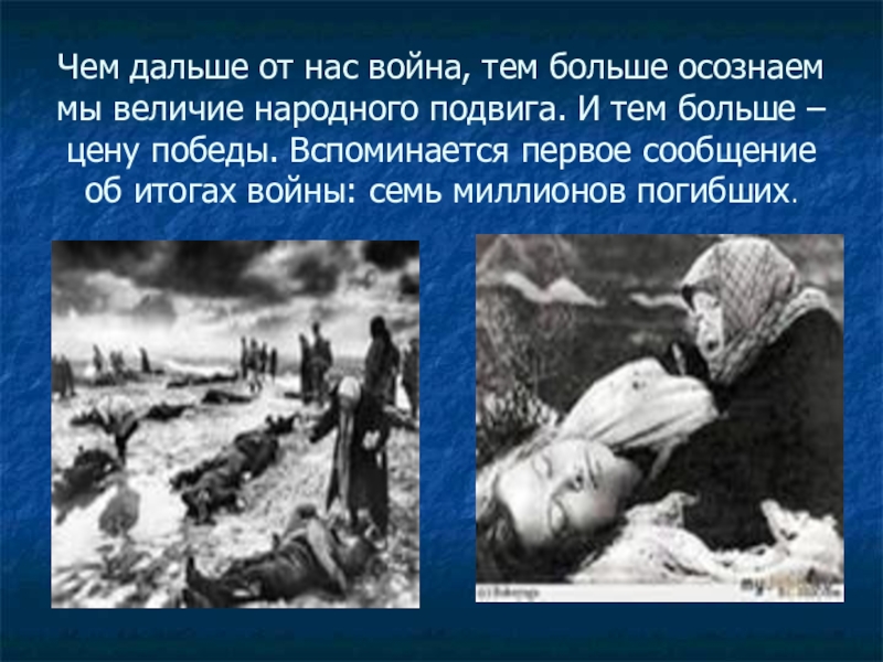 подвига. И тем больше – цену победы. Вспоминается первое сообщение об итогах войны: семь миллионов погибших.