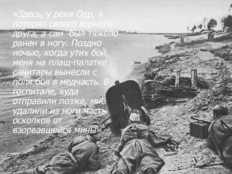 проведенных на фронте, оставили неизгладимый след в моей жизни. А одиннадцать осколков в моей ноге не дают забыть то тяжелое время» .
