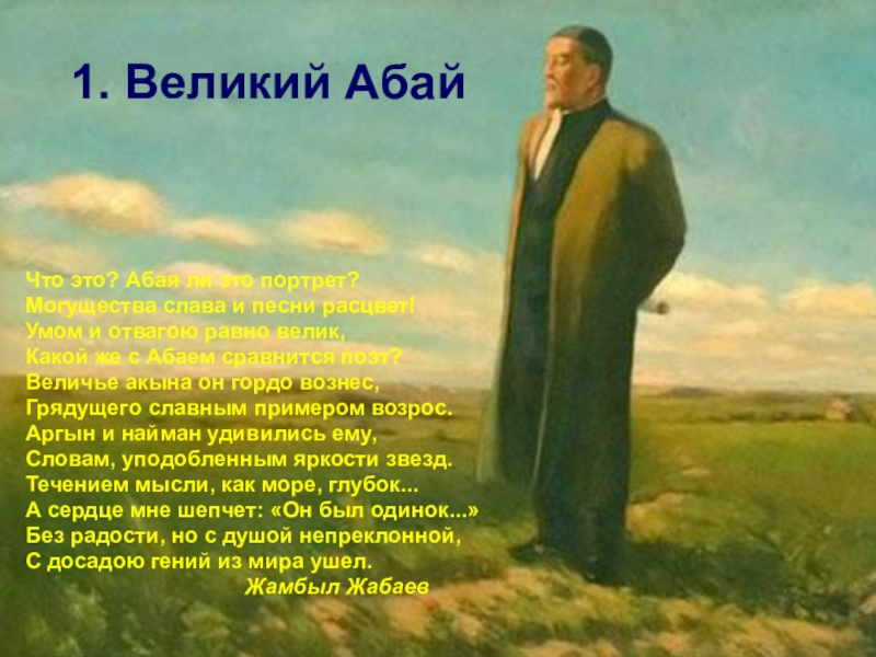 поэт казахов – Абай Кунанбаев. Ни в раннем, ни в позднем периоде истории казахов не известно имя поэта, превосходящего его по величию духа».