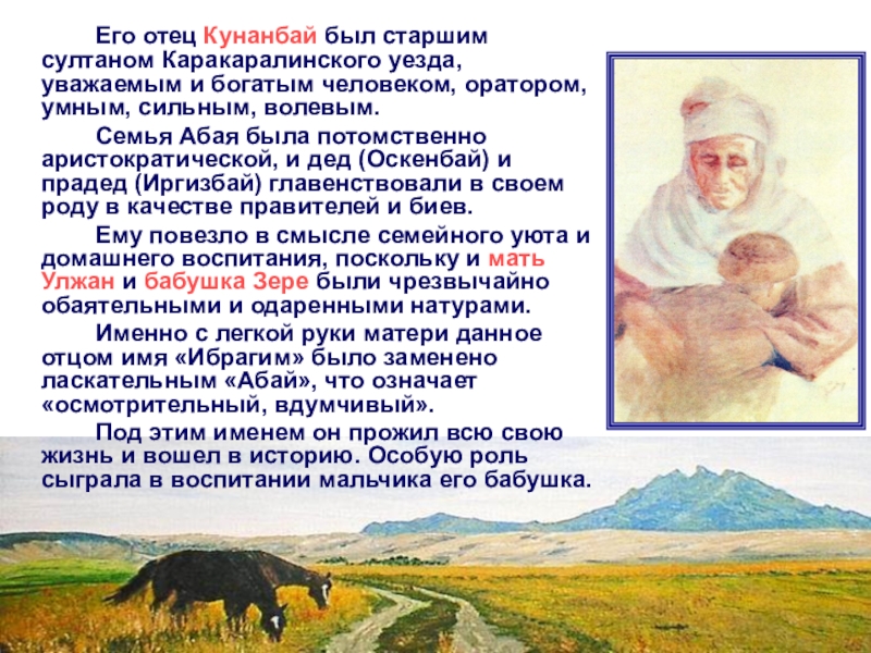Слайд 7 Его отец Кунанбай был старшим султаном Каракаралинского уезда, уважаемым и богатым