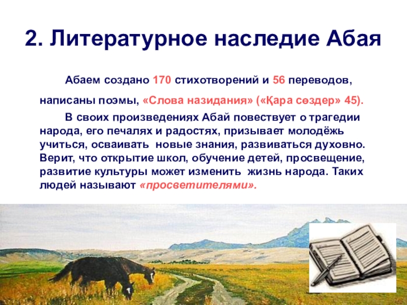 В своих произведениях Абай повествует о трагедии народа, его печалях и радостях, призывает молодёжь учиться, осваивать новые знания, развиваться духовно. Верит, что открытие школ, обучение детей, просвещение, развитие культуры может изменить жизнь народа. Таких людей называют «просветителями».