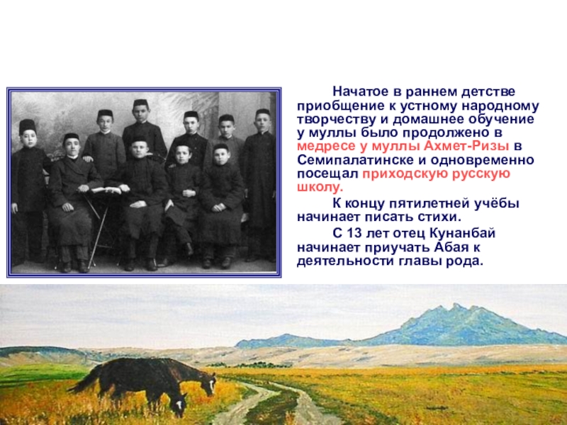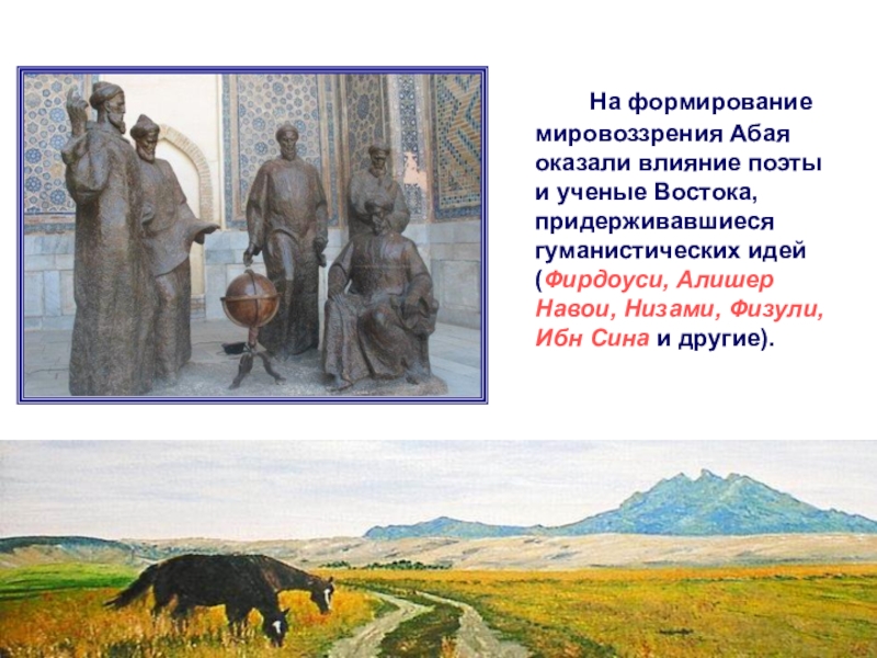 Слайд 11 На формирование мировоззрения Абая оказали влияние поэты и ученые Востока, придерживавшиеся