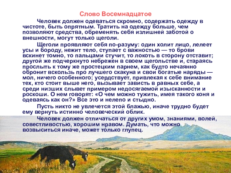 Щеголи проявляют себя по-разуму: один холит лицо, лелеет усы и бороду, нежит тело, ступает с важностью — то брови вскинет томно, то пальцами стучит, то локоть в сторону отставит; другой же подчеркнуто небрежен в своем щегольстве и, стараясь прослыть к тому же простецким парнем, как будто нечаянно обронит вскользь про лучшего скакуна и свои богатые наряды — мол, ничего особенного; усердствует, привлекая к себе внимание тех, кто стоит выше него, вызывает зависть в равных себе, а среди низших слывет примером недосягаемой изысканности и роскоши. О нем говорят: «О чем можно тужить, имея такого коня и одеваясь как он?» Все это и нелепо и стыдно.