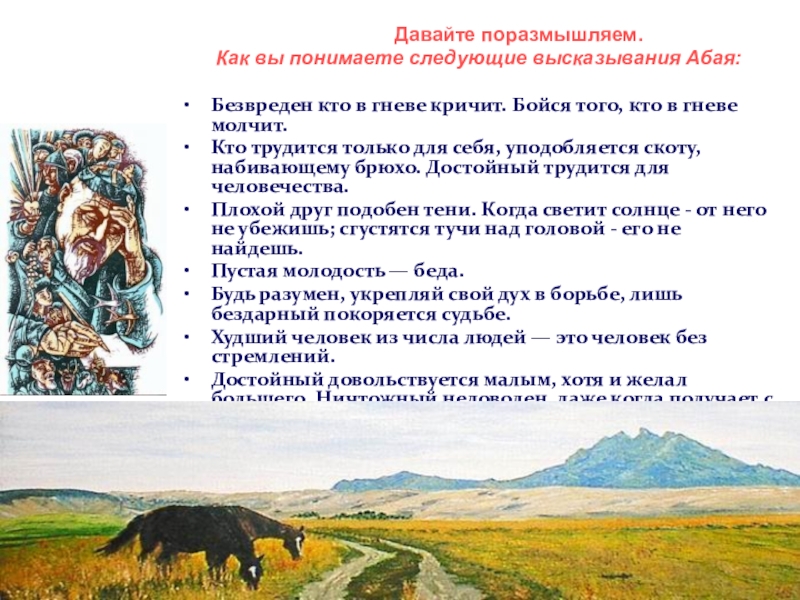Слайд 17 Проанализируйте высказывание и докажите, что Абай- действительно не превзойденный поэт.