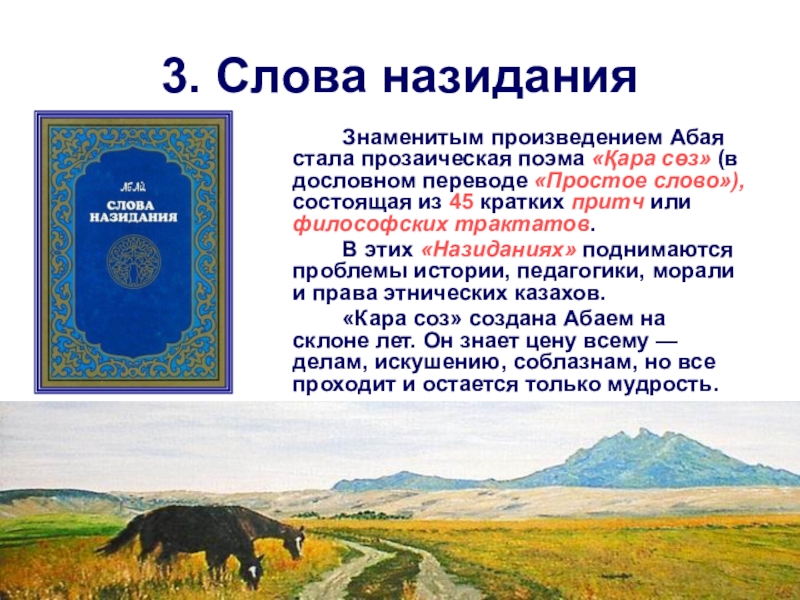 Знаменитым произведением Абая стала прозаическая поэма «Қара сөз» (в