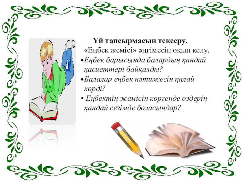 Үй тапсырмасын тексеру. «Еңбек жемісі» әңгімесін оқып келу.Еңбек барысында балардың қандай қасиеттері байқалды?Балалар еңбек