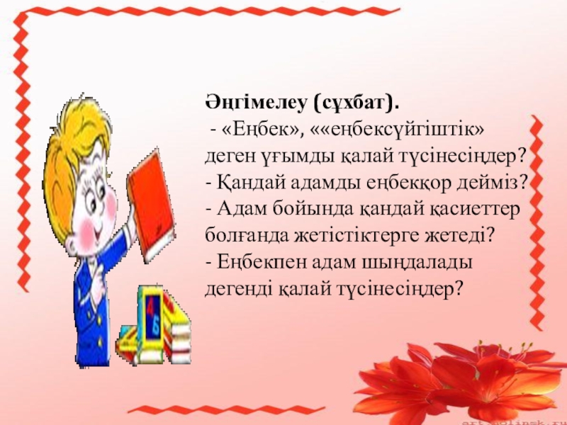 Әңгiмелеу (сұхбат). - «Еңбек», ««еңбексүйгіштік» деген үғымды қалай түсінесіңдер?- Қандай адамды еңбекқор дейміз?- Адам бойында қандай қасиеттер