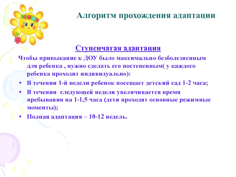 В течении следующей недели увеличивается время пребывания на 1-1,5 часа (дети проходят основные режимные моменты);