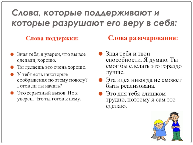Слайд 17Слова, которые поддерживают и которые разрушают его веру в себя: