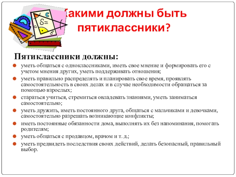 Пятикласснику уже не так интересна учеба сама по себе, многим в школе интересно бывать потому, что там много друзей. Важно, чтобы у ребенка была возможность обсудить свои школьные дела, учебу и отношения с друзьями в семье, с родителями.