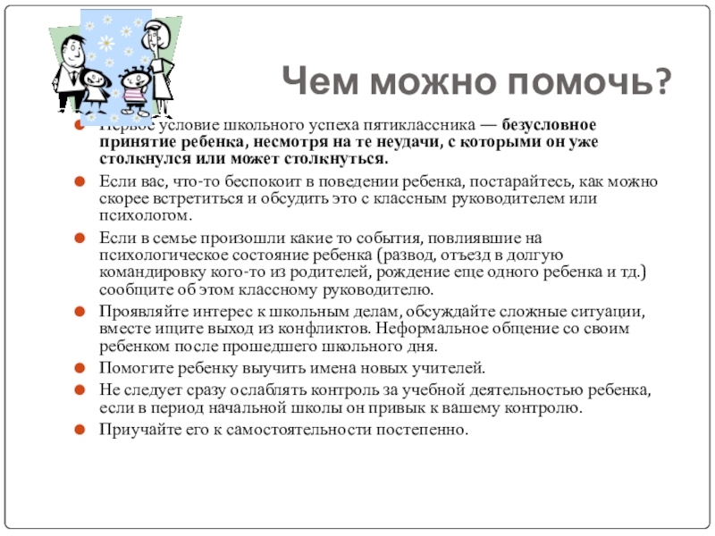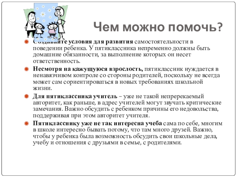 Несмотря на кажущуюся взрослость, пятиклассник нуждается в ненавязчивом контроле со стороны родителей, поскольку не всегда может сам сориентироваться в новых требованиях школьной жизни.