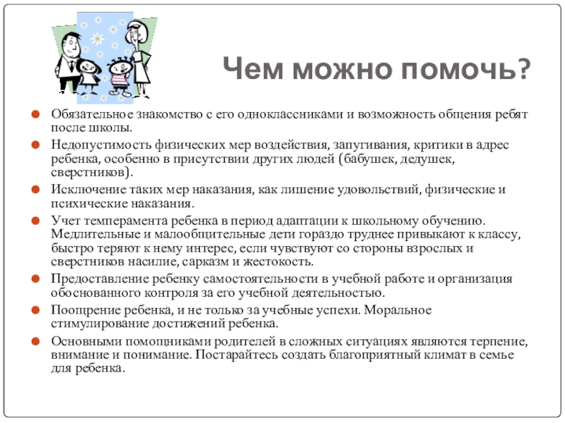Основными помощниками родителей в сложных ситуациях являются терпение, внимание и понимание. Постарайтесь создать благоприятный климат в семье для ребенка.