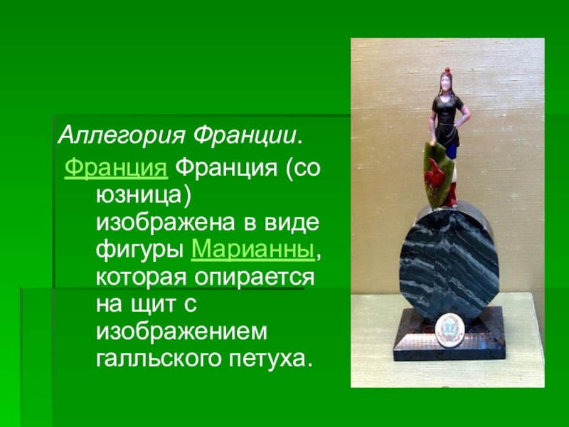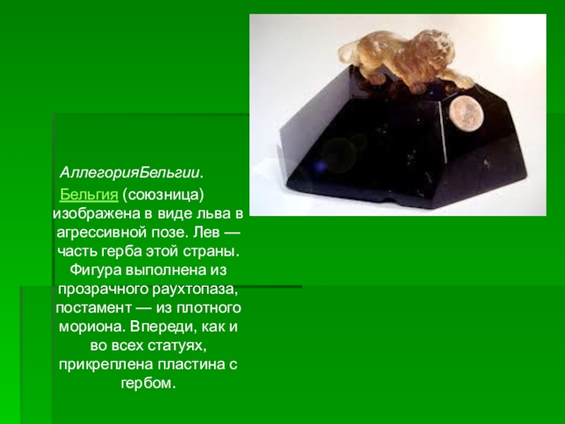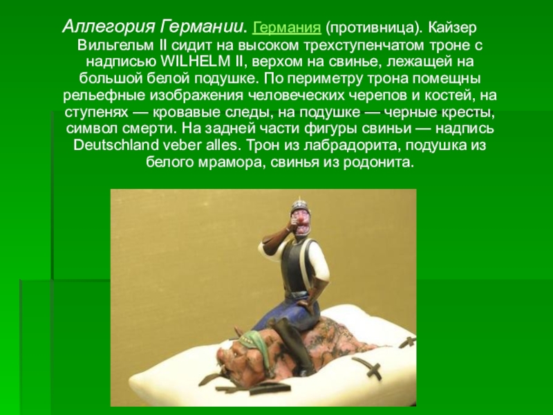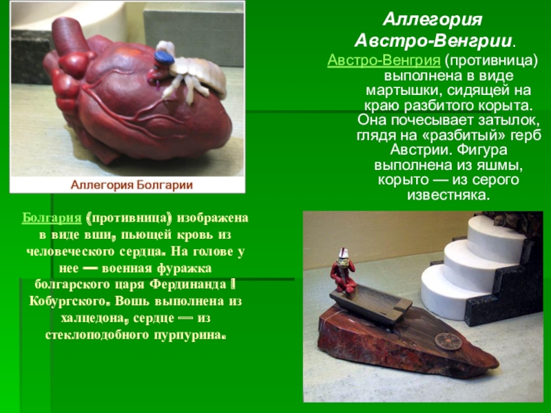 Австро-Венгрия (противница) выполнена в виде мартышки, сидящей на краю разбитого корыта. Она почесывает затылок, глядя на «разбитый» герб Австрии. Фигура выполнена из яшмы, корыто — из серого известняка.