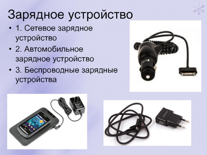 Зарядное устройство1. Сетевое зарядное устройство2. Автомобильное зарядное устройство3. Беспроводные зарядные устройства