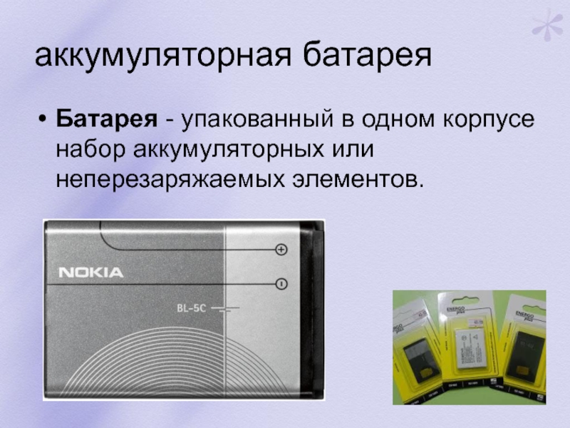 Батарея - упакованный в одном корпусе набор аккумуляторных или неперезаряжаемых элементов.