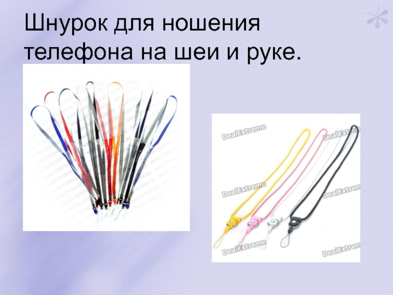 Слайд 5Шнурок для ношения телефона на шеи и руке.