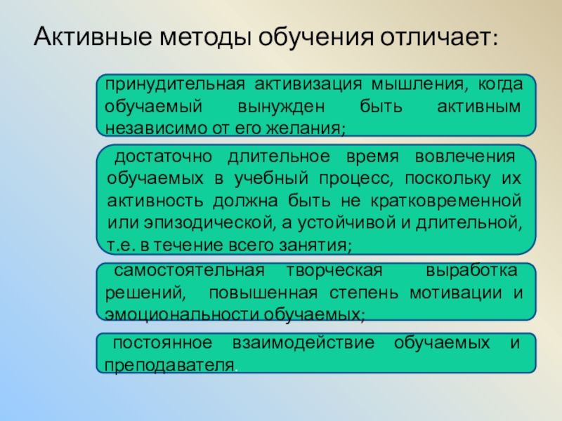 достаточно длительное время вовлечения обучаемых в учебный процесс, поскольку их активность должна быть не кратковременной или эпизодической, а устойчивой и длительной, т.е. в течение всего занятия;