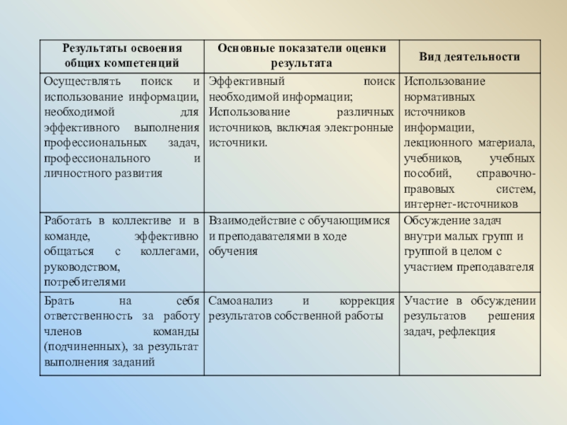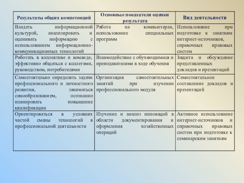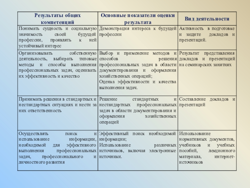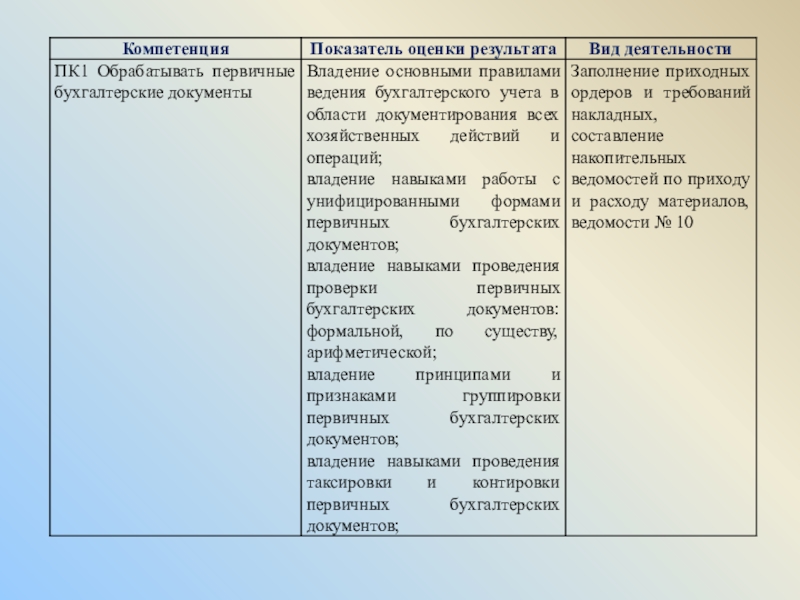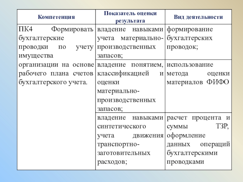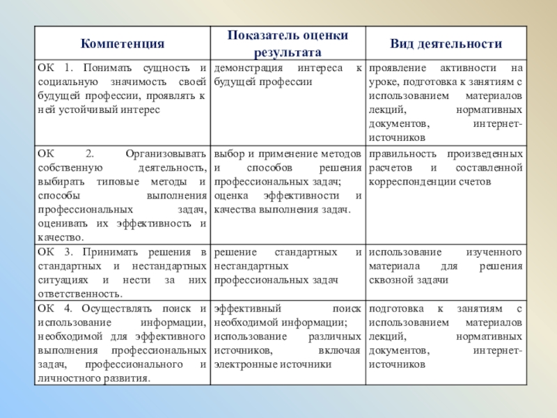 Результат освоения профессиональных компетенций - грамотность использования нормативных документов по учету источников имущества организации, выраженное в правильности составления и решения задач