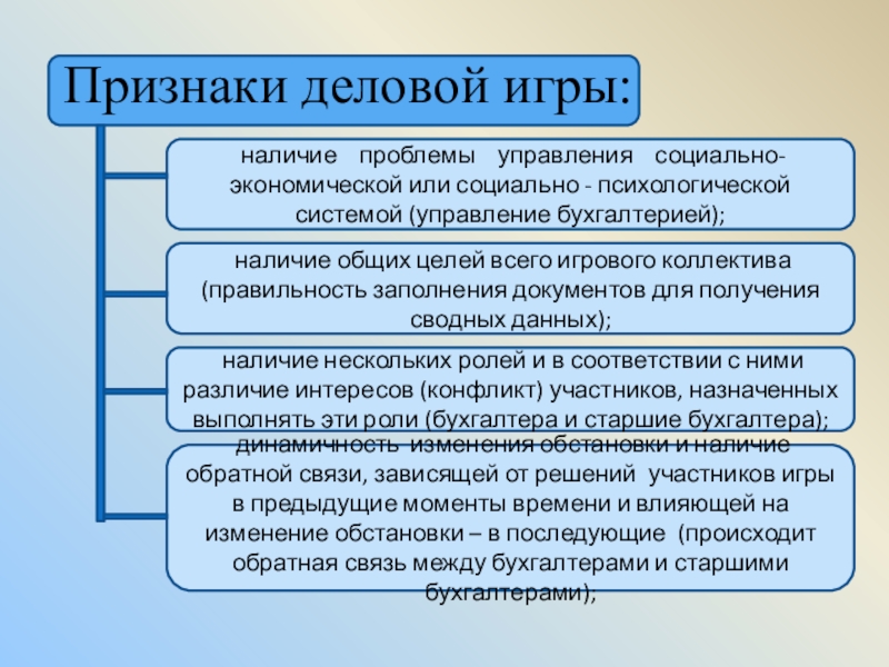 динамичность изменения обстановки и наличие обратной связи, зависящей от решений участников игры в предыдущие моменты времени и влияющей на изменение обстановки – в последующие (происходит обратная связь между бухгалтерами и старшими бухгалтерами);