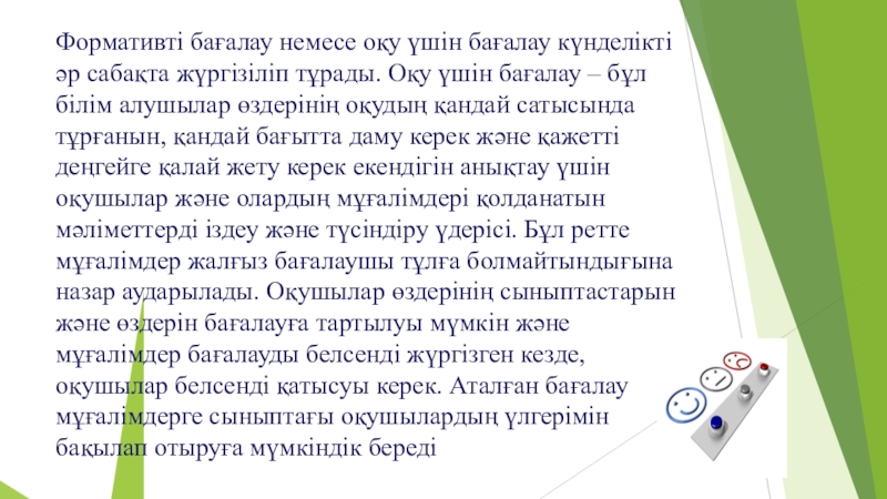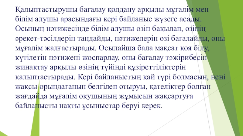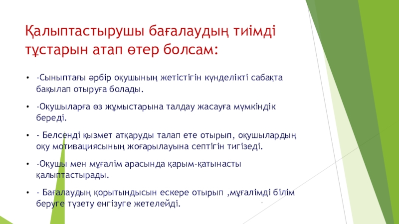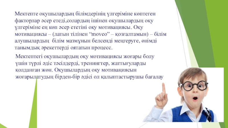 Мектептегі оқушылардың оқу мотивациясы жоғары болу үшін түрлі әдіс тәсілдерді, тренингтер, жаттығуларды қолданған жөн. Оқушылардың оқу мотиваңиясын жоғарылатудың бірден-бір әдісі ол қалыптастырушы бағалау