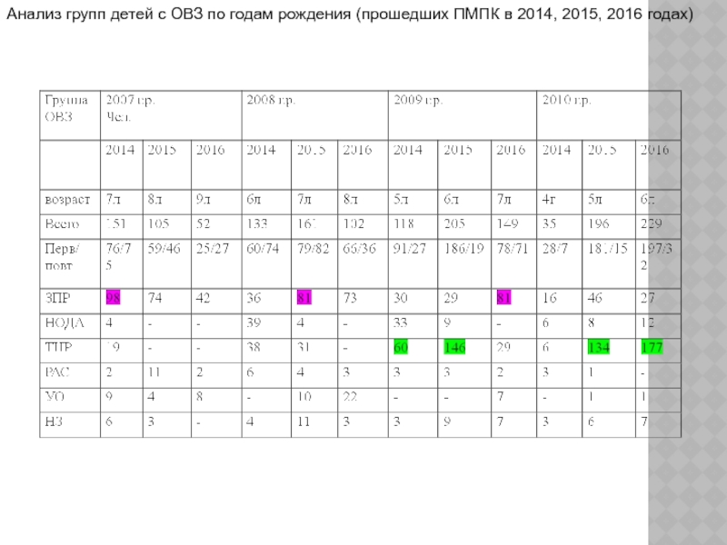 Слайд 12Анализ групп детей с ОВЗ по годам рождения (прошедших ПМПК в