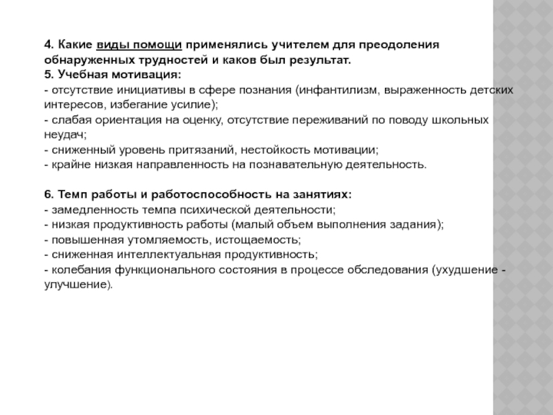 - отсутствие инициативы в сфере познания (инфантилизм, выраженность детских интересов, избегание усилие);
