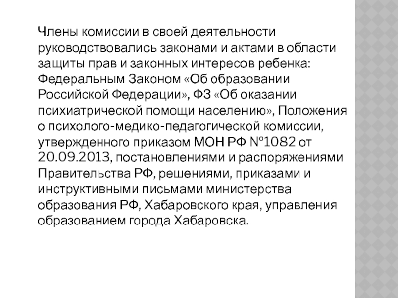 защиты прав и законных интересов ребенка: Федеральным Законом «Об образовании Российской Федерации», ФЗ «Об оказании психиатрической помощи населению», Положения о психолого-медико-педагогической комиссии, утвержденного приказом МОН РФ №1082 от 20.09.2013, постановлениями и распоряжениями Правительства РФ, решениями, приказами и инструктивными письмами министерства образования РФ, Хабаровского края, управления образованием города Хабаровска.